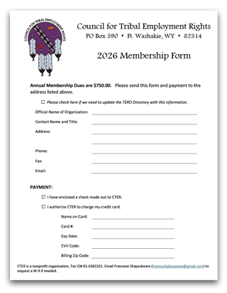 I am writing to ask you to become a 2026 Council for Tribal Employment Rights Member or renew your annual membership. Your active membership means a great deal to us as we work to further Tribal Employment Rights, Indian Preference in hiring, and healthy economic development in and around reservations. As the only organization working for native employment rights on a national level, CTER is able to advocate for each and every Tribe and Native organization and Native American and Alaskan Native in this country. The stronger our membership, the stronger the voice of CTER in fighting for your rights.